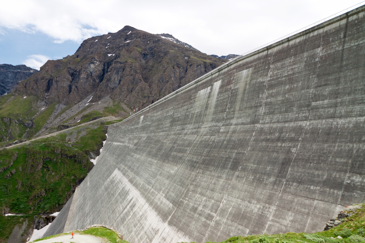 La Grande Dixence è una diga di sbarramento a gravità. Ciò significa che, a differenza di una diga di sbarramento ad arco, che scarica lateralmente la pressione dell’acqua accumulata, essa contiene l’acqua accumulata unicamente grazie al proprio peso. Per contrastare le forze risultanti è quindi necessaria una massa incredibile. Questo gigante di calcestruzzo si erge per ben 285 metri, con una larghezza alla base di 200 metri. Date le dimensioni, la Grande Dixence raggiunge un peso complessivo di 15 milioni di tonnellate. È quindi più pesante della piramide di Cheope. Il suo volume di calcestruzzo basterebbe per costruire un muro alto 1,5 metri e largo 10 cm tutto intorno alla Terra.