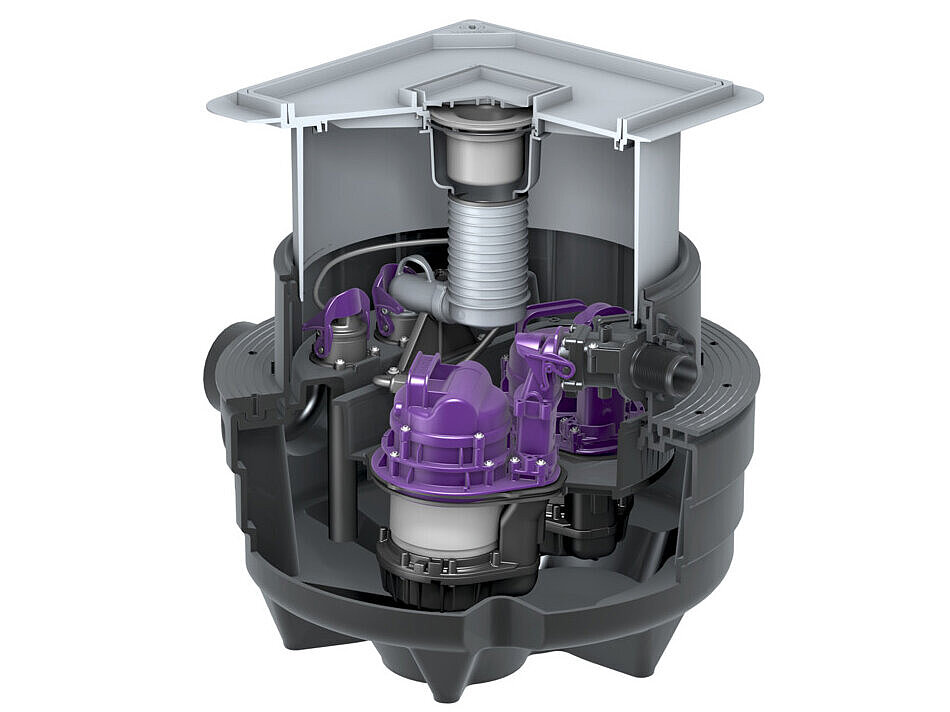 Gli impianti di sollevamento ibridi sono indispensabili ogni volta che le acque reflue si accumulano al di sotto del Livello di riflusso. Il loro punto di forza è quello di superare la forza di gravità: se non è presente una pendenza naturale verso la fognatura, sollevano le acque reflue tramite il circuito antiriflusso, in modo che possano defluire nella rete fognaria. In questo modo impediscono in modo affidabile che, in caso di eventi meteorologici estremi, l'acqua venga spinta all'interno dell'edificio.